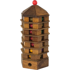 The goal of this puzzle is to turn the layers and tilt the pagoda to move the colored balls until each column of balls is the same color.