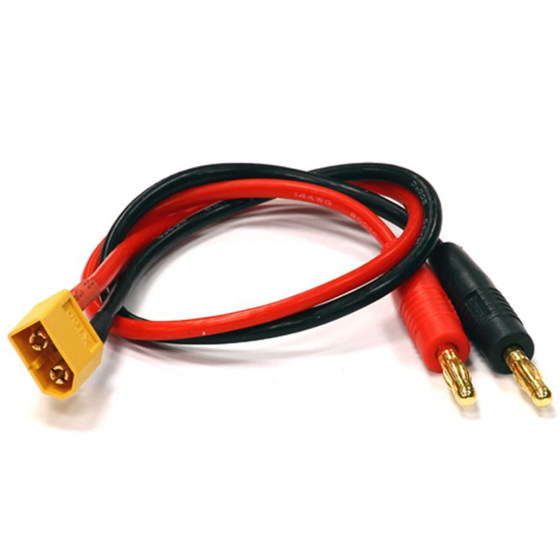 This charging cable is 11.8" (300mm) long and features an XT60 male connector. The charger end has the typical 4mm banana jacks for easy connection to your charger.