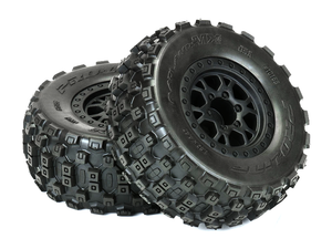 This is a pair of pre-mounted Badlands MX SC Tires on Impulse Black Wheels. Are you ready for the most Extreme Badlands Short Course Tires Pro-Line has ever made? Introducing the all-new Badlands MX SC tires that have been redesigned from the ground up to chew up the dirt and spit it out in a huge spray behind your SC truck!