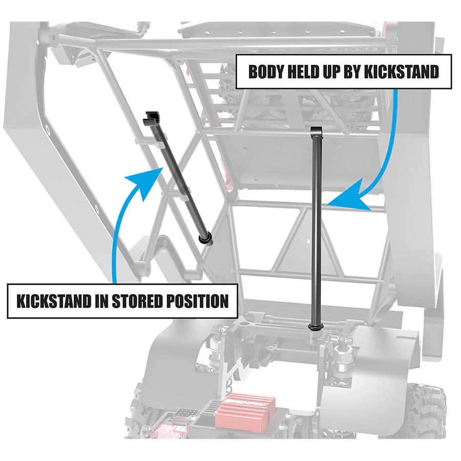 - Many scale accessories: Full inner roll cage, Inner fenders, Outer fenders, Molded snorkel, Shackle mount bumpers with D-rings and Hitch ball, LED mounts, Folding mirrors, Roof rack, Spare tire, Jack, Fuel cans, Shovel, Axe, Sand ladder.