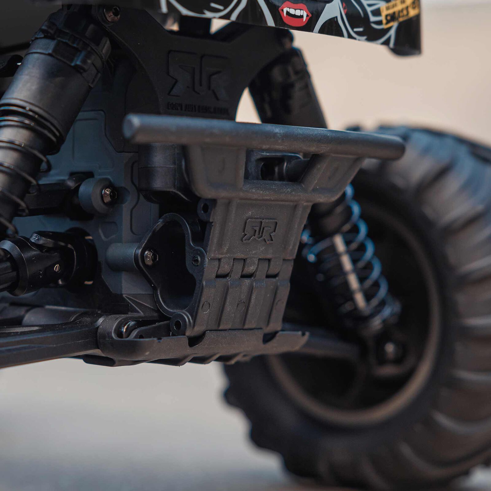 Straight out of the box, its strikingly original looks draw a crowd. The body comes factory-finished in gunmetal color, with color-coordinated shock springs, battery tray, skid plates, and front and rear bumpers that resist impacts and help protect those "fang-tastic" graphics.