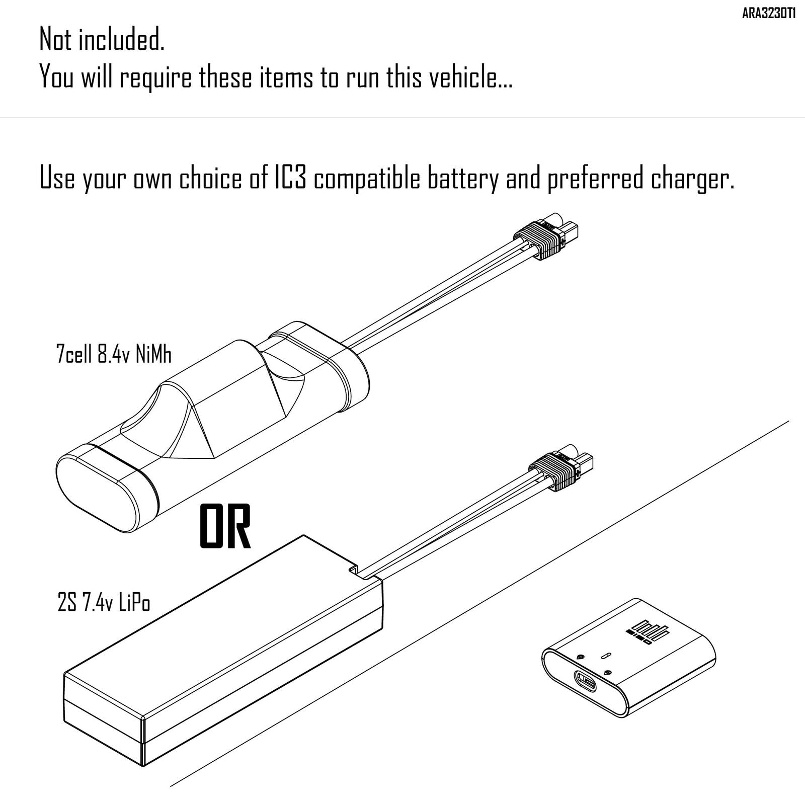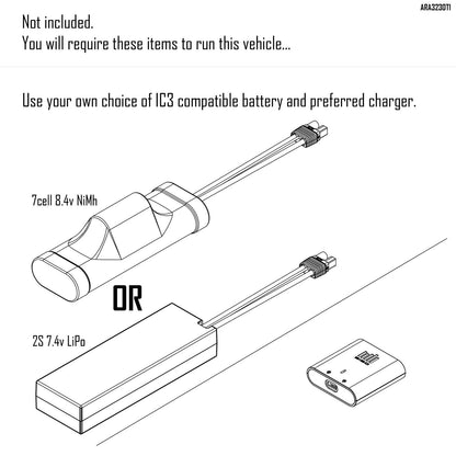(1) 7-Cell NiMH or 2S LiPo battery with IC3/EC3 Connector