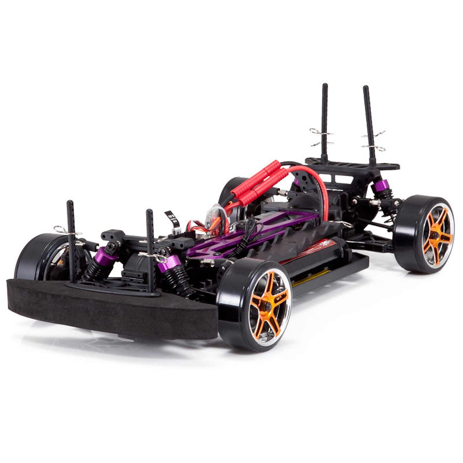- 1/10 scale drift car, Scale drift tires, 5-Star rims, Independent suspension, Lightweight plastic chassis w/ aluminum top plate, Oil filled shocks, Bearings throughout