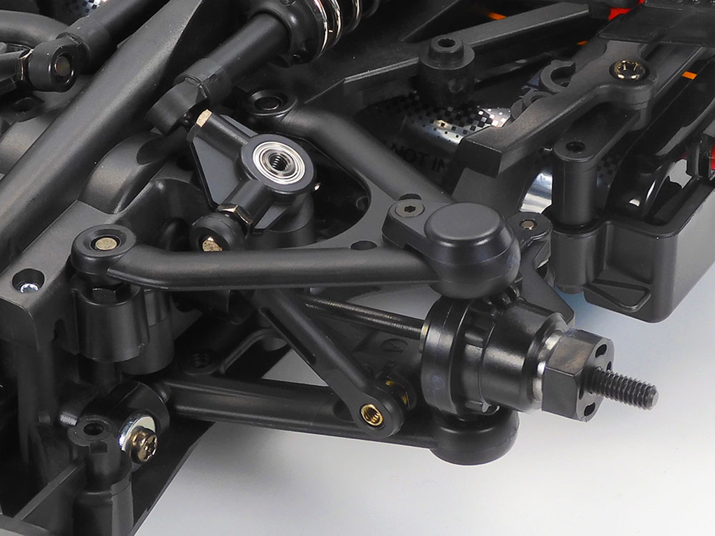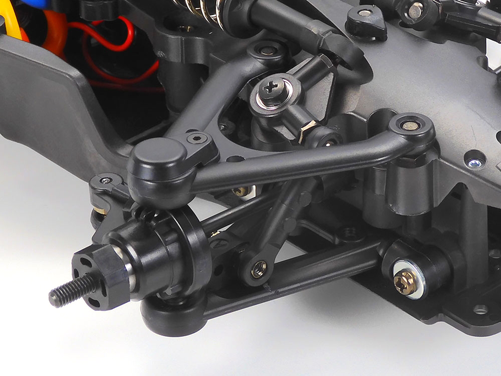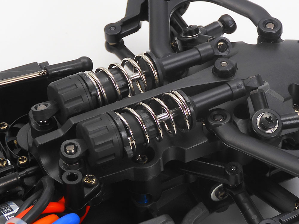 This durable composite monocoque-frame chassis provides shaft driven 4WD from a central motor via front and rear propeller shafts, with oil filled gear differentials. 4-wheel independent double wishbone suspension employs long arms, plus inboard setups front and rear with oil shock-dampers actuated by push rods and rocker arms to allow the use of low-profile bodies. Adjust spacer width to easily alter camber, skid, and toe angle settings. Both suspension arms and uprights are identical left, right, front and rear, for more efficient maintenance and pit work.
