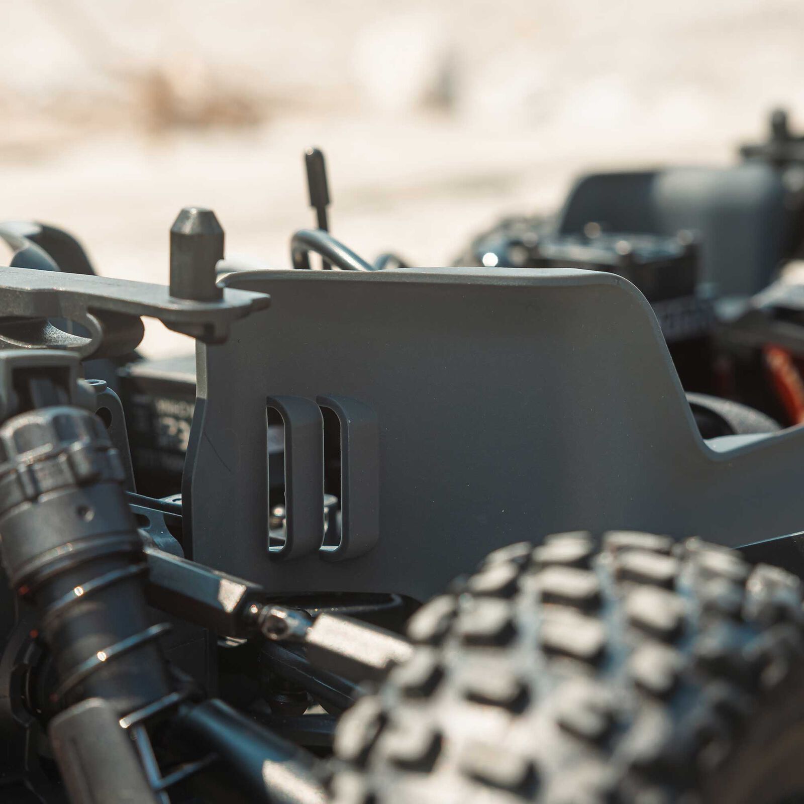 The closed-wheel design of the short course body lets you aim for the block pass in a race without worrying about getting tangled in your competitor's tires. Impact-absorbing composite front and rear bumpers and strong composite nerf bars add more protection, while higher, extended chassis side guards keep out dirt and debris. The high-quality, on-board Spektrum electronics are waterproof, so whatever the conditions, you can bash without fear.