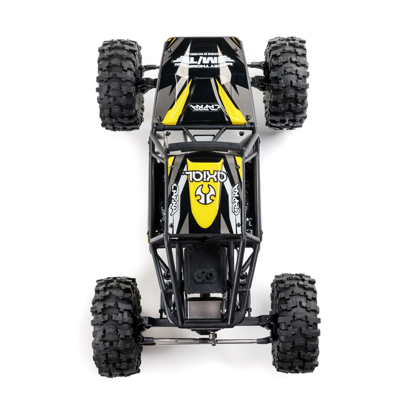 The Capra's tube chassis not only looks like a real trail buggy, but is optimized for suspension and tire clearance. Licensed Currie F9 Portal Axles also increase ground clearance while turning the scale Pro-Line OE Holcomb 1.9 wheels and Pro-Line OE Mickey Thompson Baja Pro X tires. The tires feature aggressive tread for out-crawling the competition. Dual stage, open cell foam inserts are included, with soft outer foam and firm inner foam to improve grip and sidewall support. Both axles feature metal universals for a smooth, efficient, and durable drivetrain.