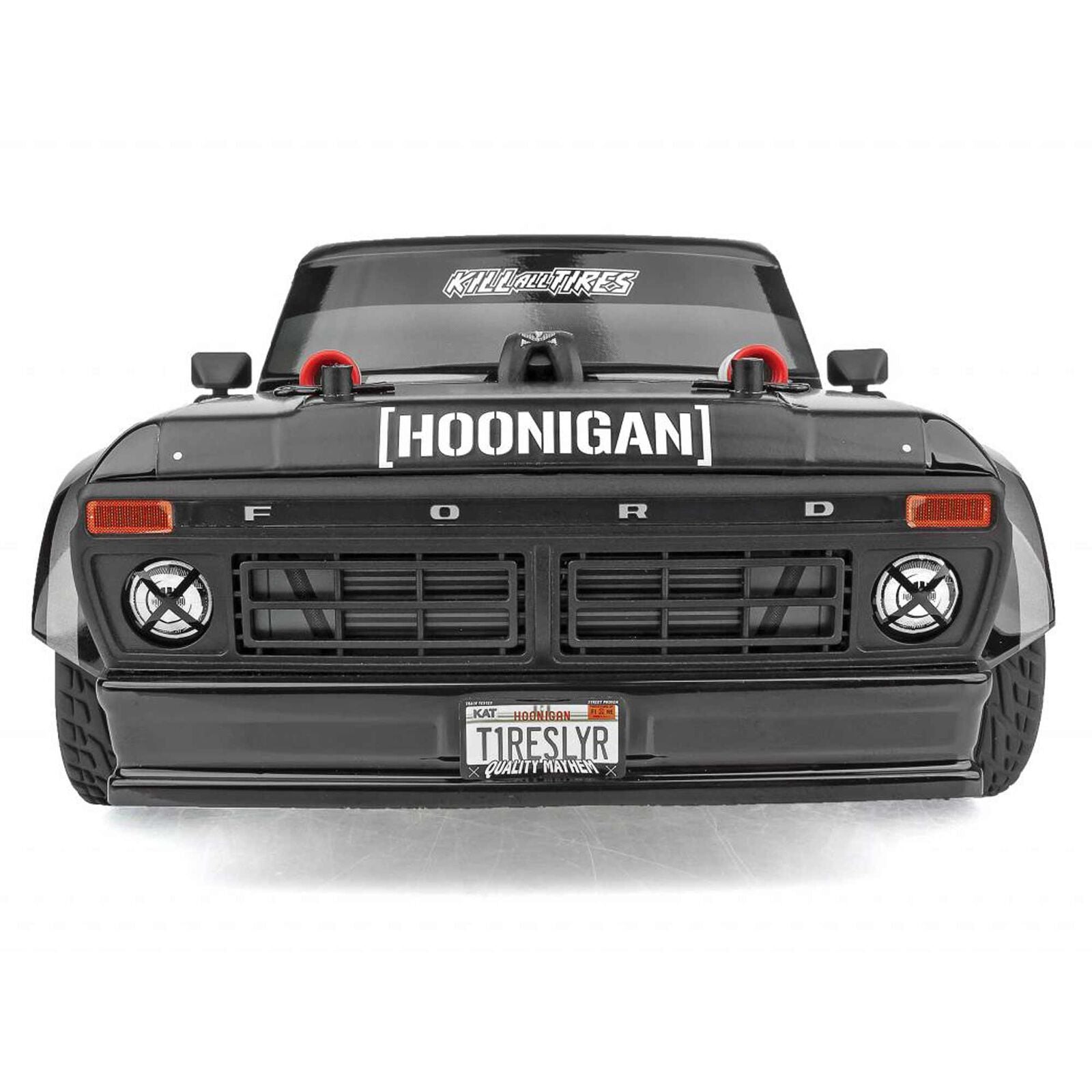 The Reflex 14R chassis has been updated from our previous version with the latest features in on-road racing. Sealed front and rear gear differentials, a molded tub chassis with covered center driveshaft, and adjustable shock positions—these extra features make it a perfect platform for the Hoonitruck’s tire-slaying action!