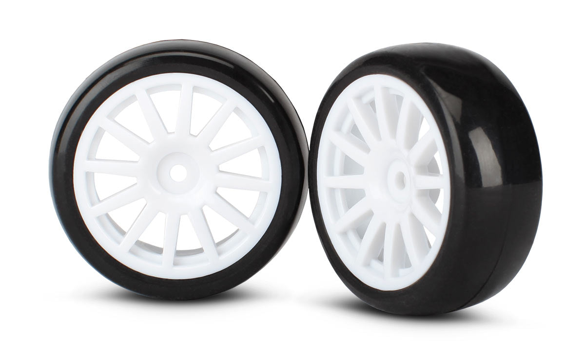 - Pre-glued, low-profile slick tires mounted on white, 12-spoke rally wheels