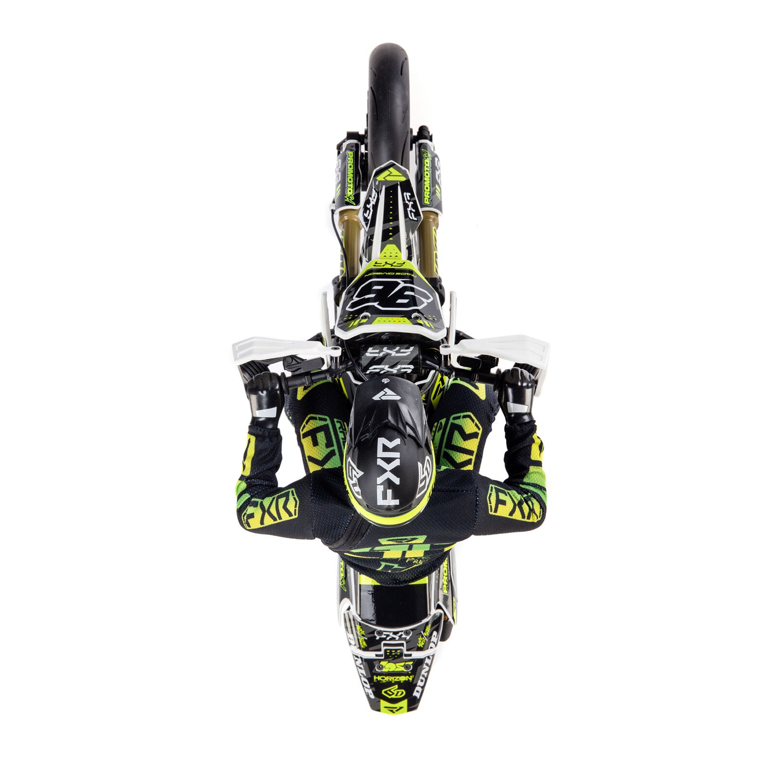 The Losi Promoto-SM also looks like a true supermoto bike. Its distinctive visual details include hand guards, shortened front fender, and officially licensed FXR graphics and rider gear.
