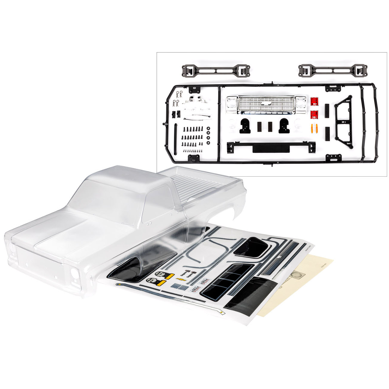 The clear TRX-4 1979 Chevrolet K10 High Trail Edition body comes fully trimmed and ready to paint with decal sheets, window masking, clipless body latches, molded body accessories with mounting hardware, and pre-applied overspray film.