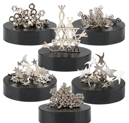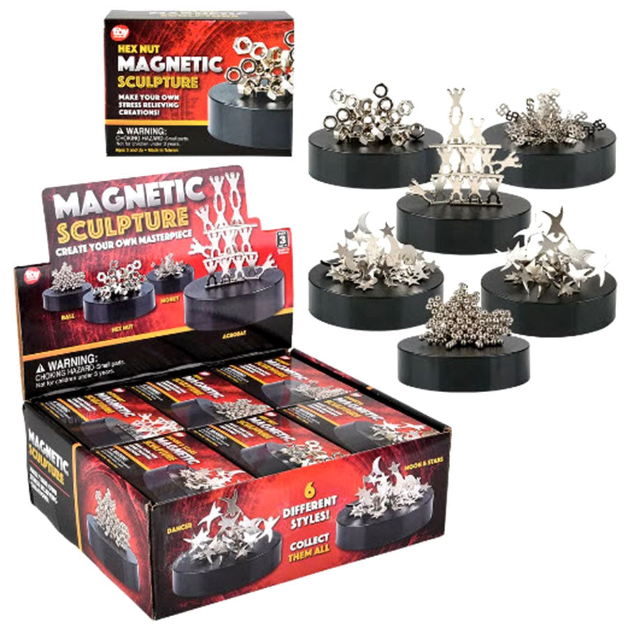 Make your own stress relieving creations with this 3.5" Magnetic Sculpture Assortment. There are 6 different styles and you can collect them all! Styles include: ball, hex nut, acrobat, money, dancer, and moon & stars. Comes with a magnetic platform to stabilize sculptures while you work.