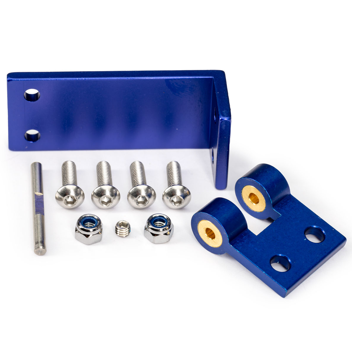 Blue-anodized aluminum rudder mount and hinge pin includes stainless 4x14 mm stainless screws (4), 4 mm lock nuts (2), and 4x3 mm grub screw.