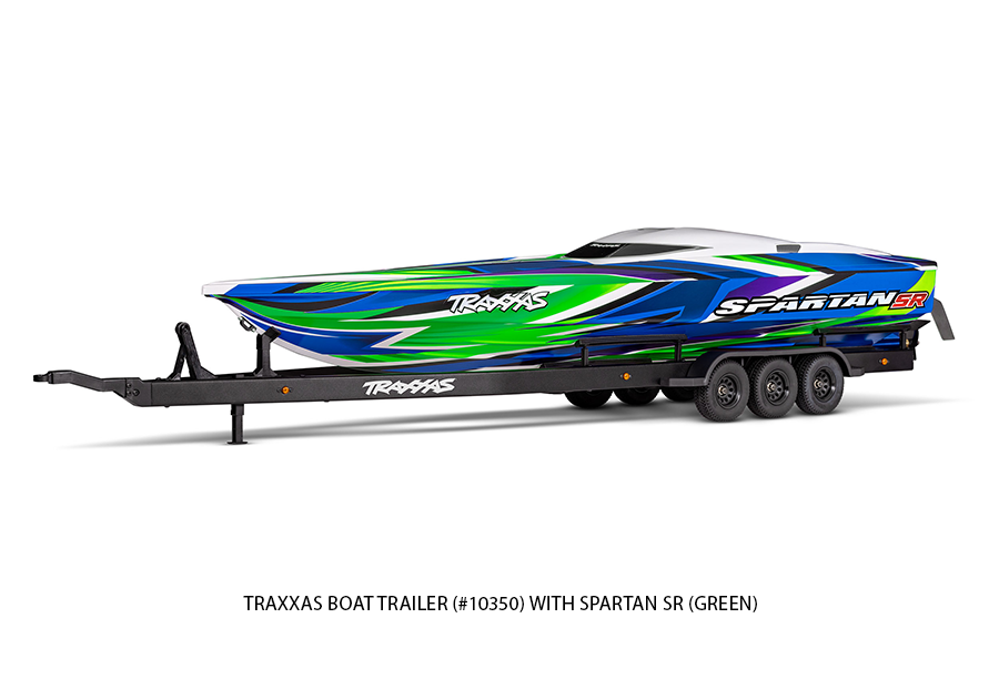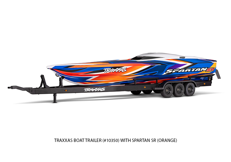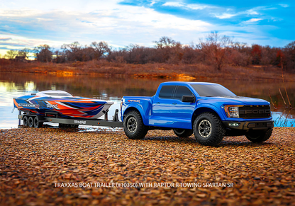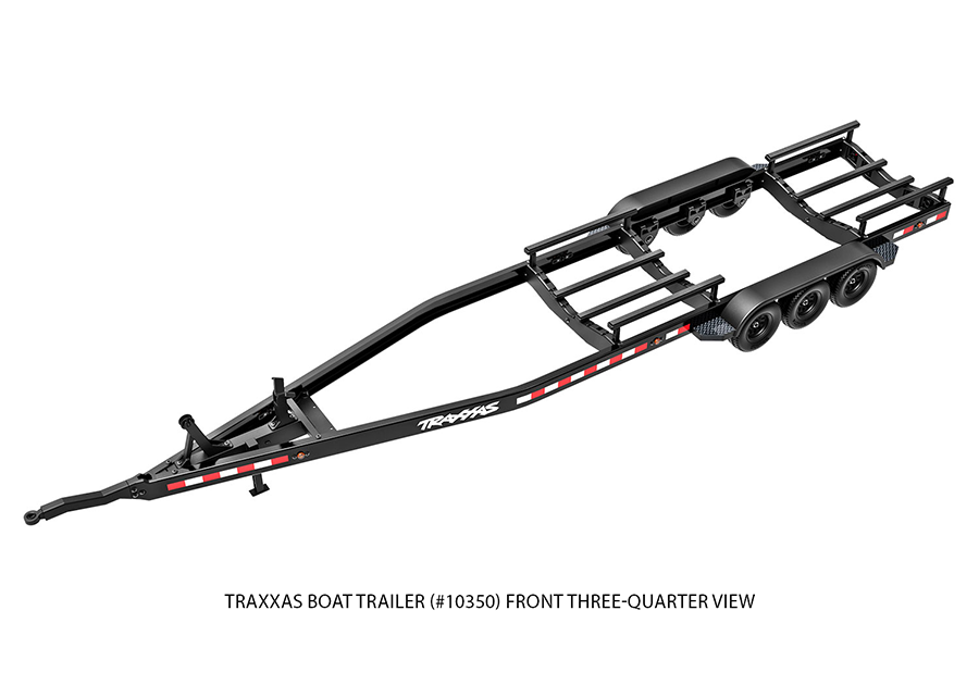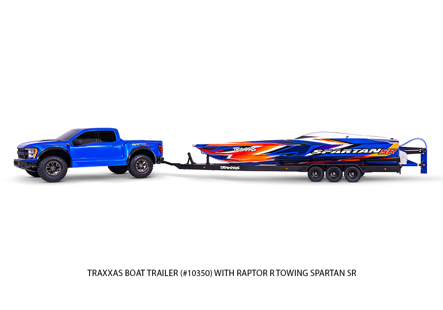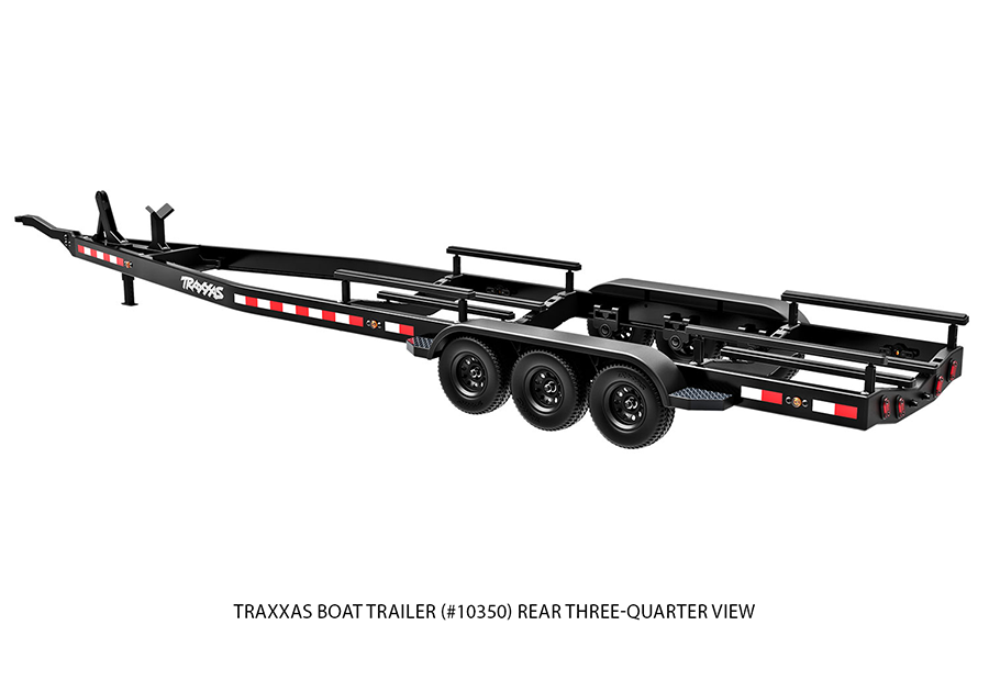 Transport your Traxxas boat to the lake in style with this fully detailed scale replica triple-axle trailer. Adjustable bunk brackets accommodate either the Spartan’s deep-V hull or the DCB-M41’s catamaran hull. Elastic tie-downs hold the boat securely to the trailer’s lightweight, full-length aluminum frame. You can even challenge your trailering skills by backing the trailer onto the ramp using your TRX-4 or Traxxas Ford® Raptor R™ with the included variable-height hitches.