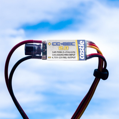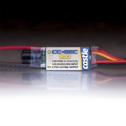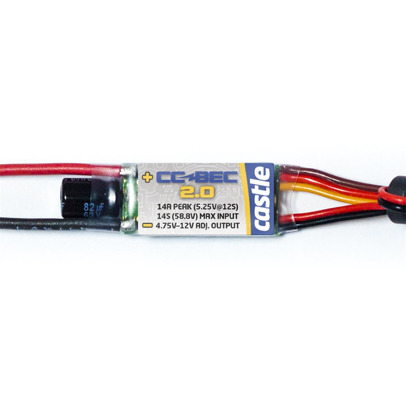 The CC BEC 2.0 features heavy duty, dual output wires that will provide clean power to sensitive radio equipment. Castle Link² can be used to set the output from 4.75 to 12 volts and power today's power hungry servos, cameras, and other accessories. Do it right the first time, invest in the CC BEC 2.0 to protect expensive electronics for the long haul.
