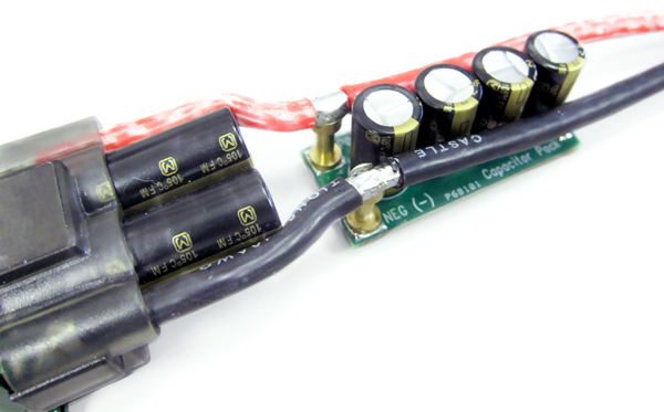 CC CapPack is designed for quick and easy installation. Users simply cut the soft silicone insulation on the battery wires – do this as close to the ESC as possible – and place the exposed wires in the channels on CC CapPack's posts. Check for proper polarity and then solder the wires to the posts. Use the included heat shrink to finish it off for a professional looking install.