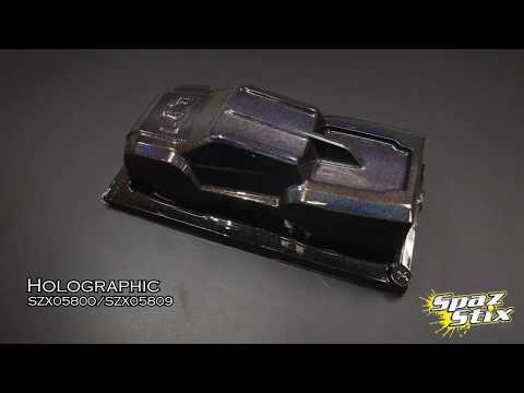 Spaz Stix Holographic Color Change paint is a translucent (see through) color that when applied correctly, will produce eye-popping results. Always apply a fine mist of Spaz Stix Surface Pre-Prep (SZX90050 or SZX90059) to the surface you are working on before using the Color Change paint. This helps eliminate fingerprints and undesirable swirls in your paint job. Color Change paints spray out very clear, and will require several light coats to achieve best results. At this point, the color will be very faint. After achieving an even finish with the Color Change paint, you MUST apply Spaz Stix High Gloss Black/Backer (SZX00110 or SZX00119), which will make your color "pop".