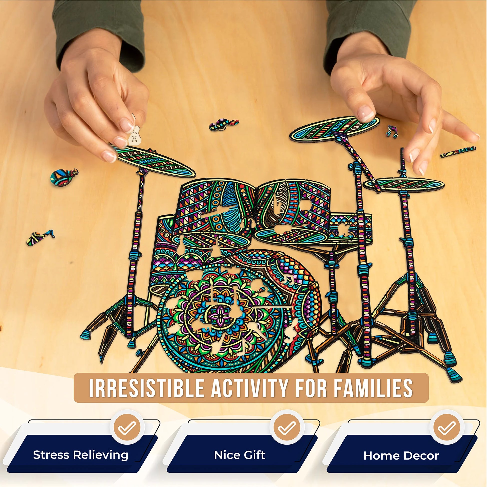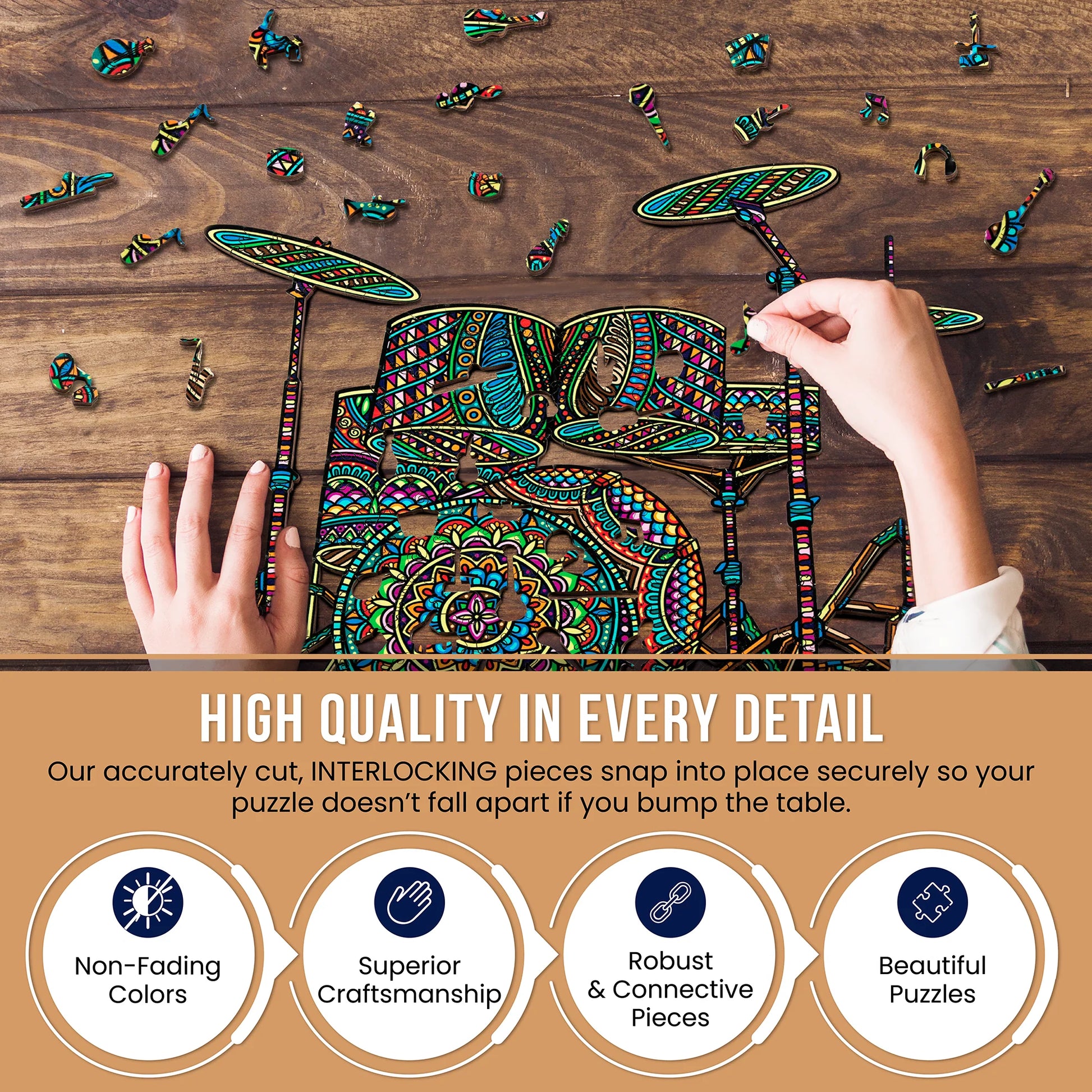 Precision-Cut Pieces: A home decoration in the making, our puzzle comes with precision-cut interlocking wooden pieces that snap tightly into place. Easy to lift without falling apart to display as wooden art, adding colors and texture to any home decor: a set of drums silhouette-shaped puzzle for adults that pairs as an art decor piece to frame and securely display for all to admire.