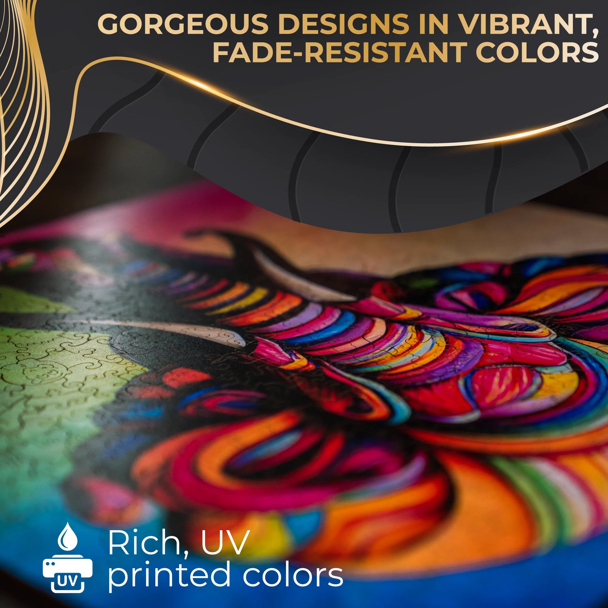 500-Piece Unique Wooden Puzzle: "Elephant" is a visually stunning puzzle that captures the essence of majestic elephants in vibrant colors. This puzzle features 58 beautifully crafted and uniquely-shaped pieces that showcase a herd of colorful elephants traversing through a scenic landscape. The bright and vivid colors make this puzzle both challenging and fun for puzzlers of all levels. This set comes with a handy burlap bag to keep your pieces safe and organized, and the finished size of 16.5" x 16.5" makes for a beautiful display once completed. Get ready to be transported to a world of vibrant colors and majestic creatures with this delightful puzzle.