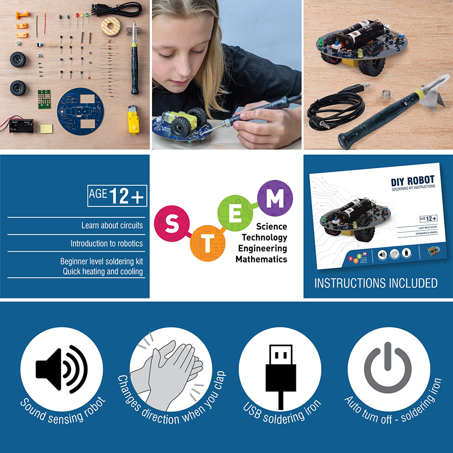 Build this clever robot that moves whenever you clap or make a loud sound! This set is complete with both the DIY kit and the USB soldering iron, perfect for beginners!