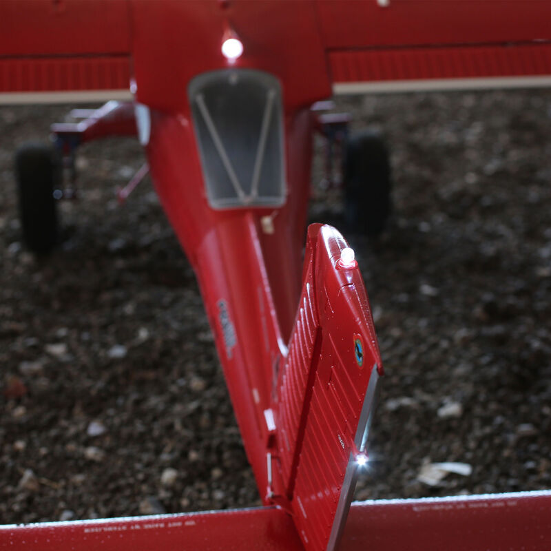 The clear windshield and windows offer an excellent view of the detailed cockpit with pilot figure and backlit instrument panel. Functional Extra Scale features include licensed, scale-like KING shocks on the main gear and tail wheel, leading-edge slats, slotted flaps and more. There are also a total of 17 LEDs throughout the airframe — with a custom controller that allows you to select solid, strobing and other light combination options from your transmitter. Oversized, tundra-style tires on the custom-made carbon fiber main gear soak up bumps and provide excellent prop clearance, while the shock-absorbing and steerable tailwheel offers improved ground handling — even when taxiing backward with the optional-use motor reversing (compatible Smart receiver and 7+ channel transmitter required for reversing).