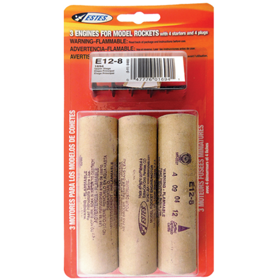 The Estes E12-8 engine is a 24mm diameter upper stage engine designed for model rocket flight. This engine can also be used as a single stage engine. Maximum lift weight is 12 ounces.