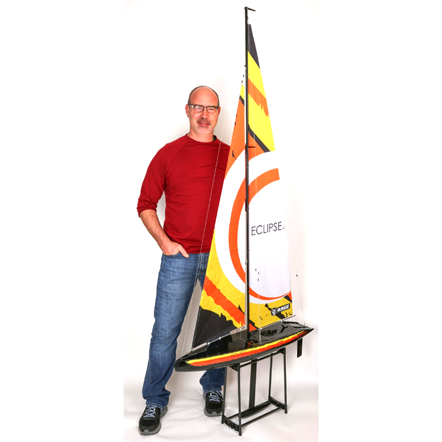 Perhaps the most impressive feature of this sailboat is the size - measuring over 7' (213cm) tall from the bottom of the ballast bulb to the tip of the mast. The Eclipse 1M is a RTR boat, and arrives with everything required to start sailing except for the AA batteries. In addition to the pre-trimmed and decorated hull, inside you'll find a 2.4GHz radio system, rip-stop nylon sails and all the rigging parts necessary to easily build the mast. It also includes a lightweight boat stand for display and maintenance. Best of all, the Eclipse is quickly and easily dismantled for storage and transportation.