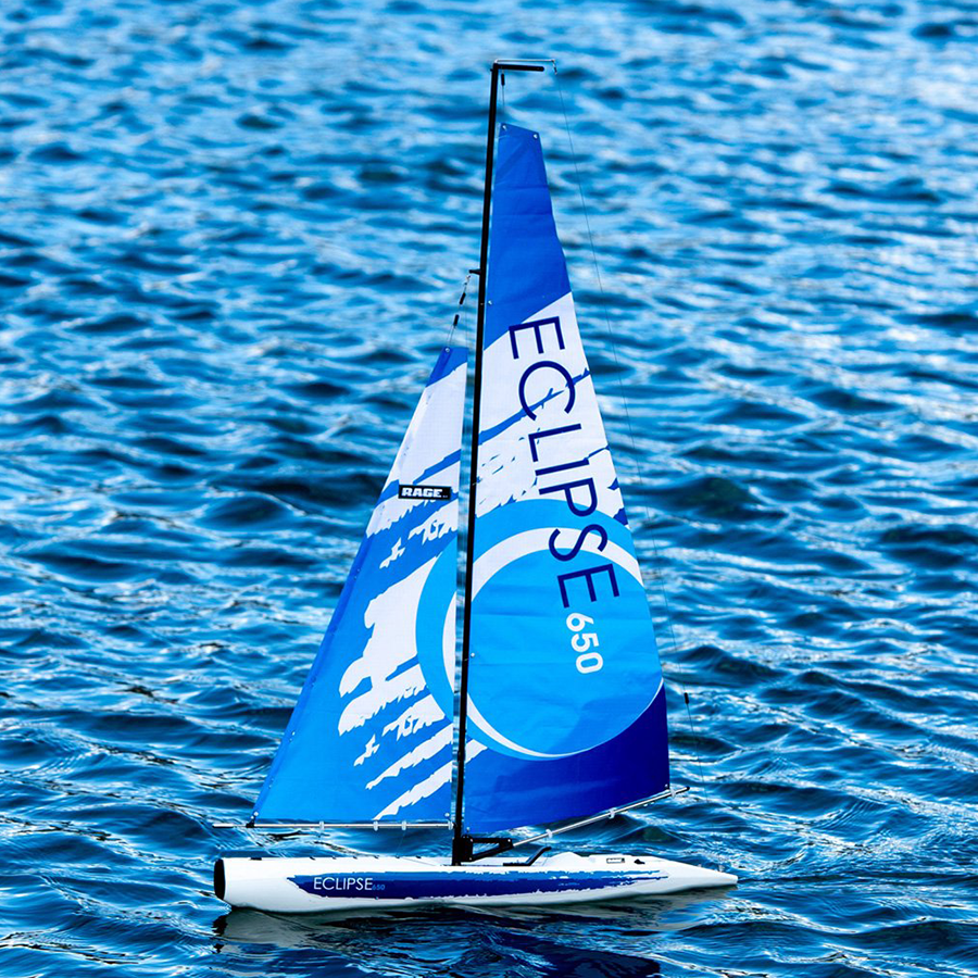 Whether you're a first timer or have years of experience as an RC boating enthusiast, the Rage RC Eclipse 650 sailboat is the ideal sailboat for you. The Eclipse 650 hull is blow-molded from ABS for added durability and the attractive pre-applied trim design gives it the look of a full-size sailboat when you're sailing your local lake or pond. For convenience, the Eclipse 650 arrives pre-assembled with the sails partially pre-rigged to help make getting on the water fast and easy. Plus, it's the ideal size to fit in either the back seat or trunk of your car for heading to your local body of fresh water. For performance, the Eclipse 650 includes a 17g "drum-style" winch servo that provides power and smoother, more scale-like operation than traditional servos.