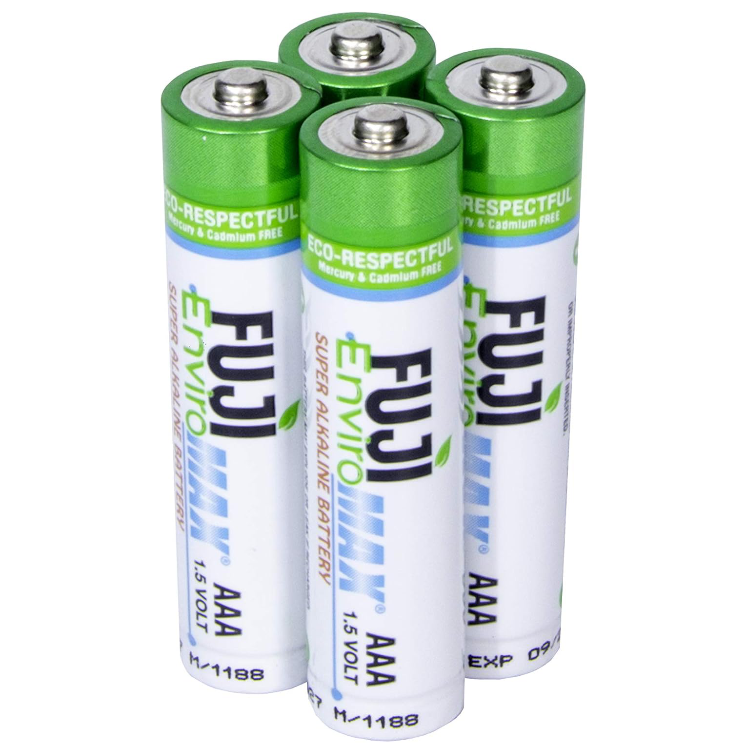 From Fuji comes environmentally respectful yet powerful batteries—the EnviroMax Super Alkaline Batteries! This 4 pack of AAA batteries is designed for digital and high-drain devices and exceed industry standards with their 10-year shelf life. Nor are they packaged in non-recyclable PVC plastic. Instead, Fuji EnviroMAX batteries are made in some of the world’s most environmentally friendly battery plants, operating under some of the most strict standards of environmental responsibility.