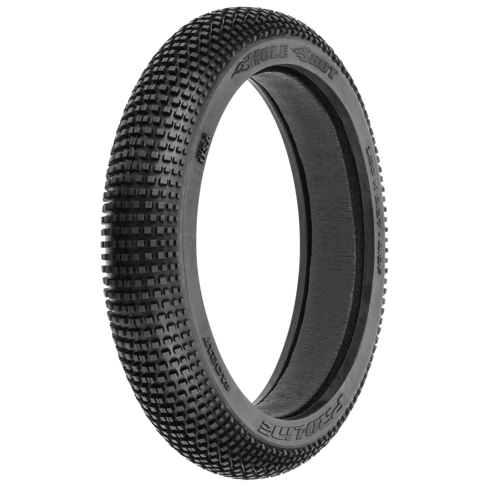 This is a Hole Shot Motocross Front Tire. Pro-Line's innovation team is proud to bring the competition-quality tire that you know and trust to the revolutionary PROMOTO-MX motocross bike. The iconic mini-pin Hole Shot tread design provides the optimum level of traction in dusty, hard-packed, and grooved conditions. The soft M3 compound and closed cell insert make the Hole Shot the ideal tire to smoke your buddies at the local dirt track! This tire is 100% focused on all-out performance, and it's especially effective when the track is watered.