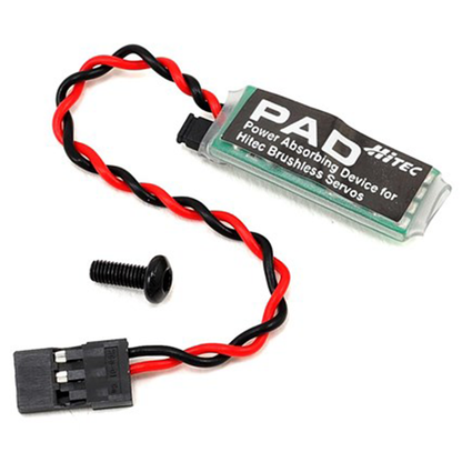 While compatible with most radio control devices, the regenerative braking feature of the HSB-9XXX series servos may cause a problem if the device cannot accept a backflow of current. The types of devices that cannot accept this backflow are: Voltage Regulators, Power Safe Receivers and certain BEC circuits whether stand alone or integrated within an Electronic Speed Control. Check with the manufacturer or the Hitec website for a list of compatible models. If your device cannot accept a current backflow, then you must install a PAD (Power Absorbing Device - HRC55756) as described in the manual. A PAD is included with every Hitec brushless servo.