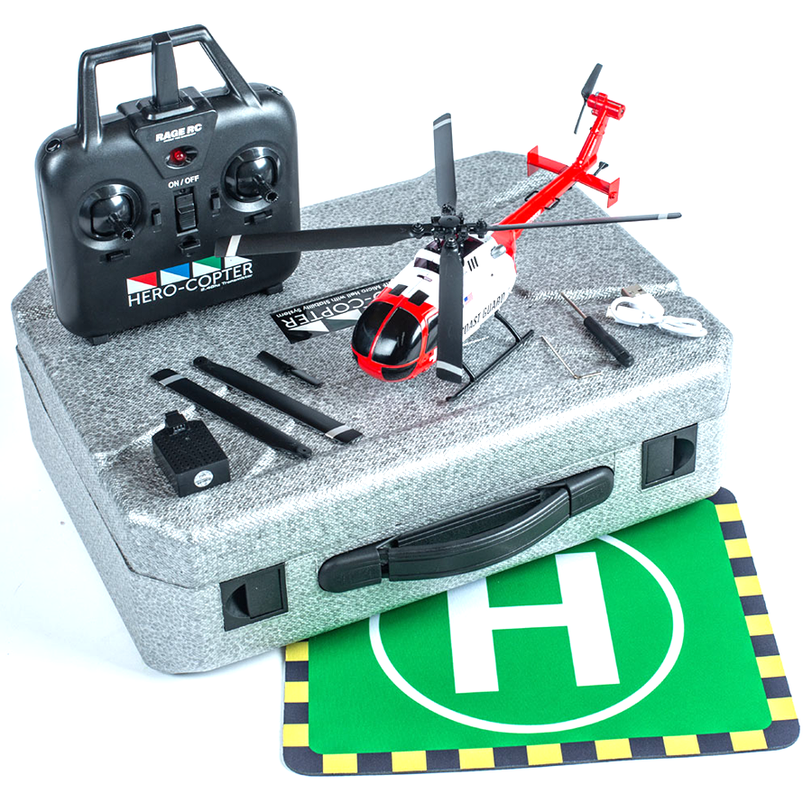 The Hero-Copter is the next Rage RC helicopter that takes the ease of flying a micro heli to a whole new level. This new scale-like heli is equipped with all the features that make RC drones easy to fly, such as 6-axis flight control, auto take-off and land, altitude hold, plus three flight modes (beginner, intermediate, and advanced) that make it fun to fly for pilots of all skill levels. A coreless main motor provides plenty of power and 2-gram digital servos provide precision and responsive control. The Hero-Copter provides long flight times of over 15 minutes due to the safe, convenient 2S 350mAh plug-in battery so you can maximize your flying time indoors (in appropriately sized spaces) or outdoors in little to no wind.