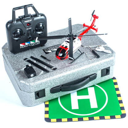 As a homage to important branches of public service, the Hero-Copter arrives out-of-the-box in one of four different pre-painted and pre-trimmed semi-scale versions. The Hero-Copter is also a RTF (Ready-To-Fly) aircraft, so it arrives factory-assembled with everything needed to experience the fun of flying a RC heli - like a 2.4GHz 4-channel transmitter, a USB charger for the included flight battery, and even an extra set of rotor blades. The package doubles as a carry case with handle for safe storage and makes it easy to transport to your local flying site. The only thing you need to add is four AA batteries for the transmitter and you'll be flying a fun scale-like heli in your favorite public service design shortly after opening the box!