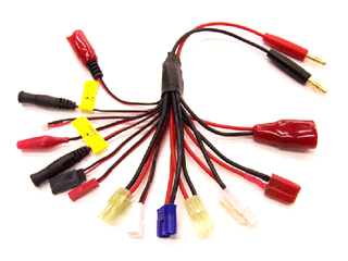 Never be at a loss for the correct charging cable adapter again. This multi-connector cable makes it really easy to charge any battery, regardless of which connector the battery has. Ideal for a flying club charging set-up where several flyers with batteries having different types of connectors can charge from the same power source.