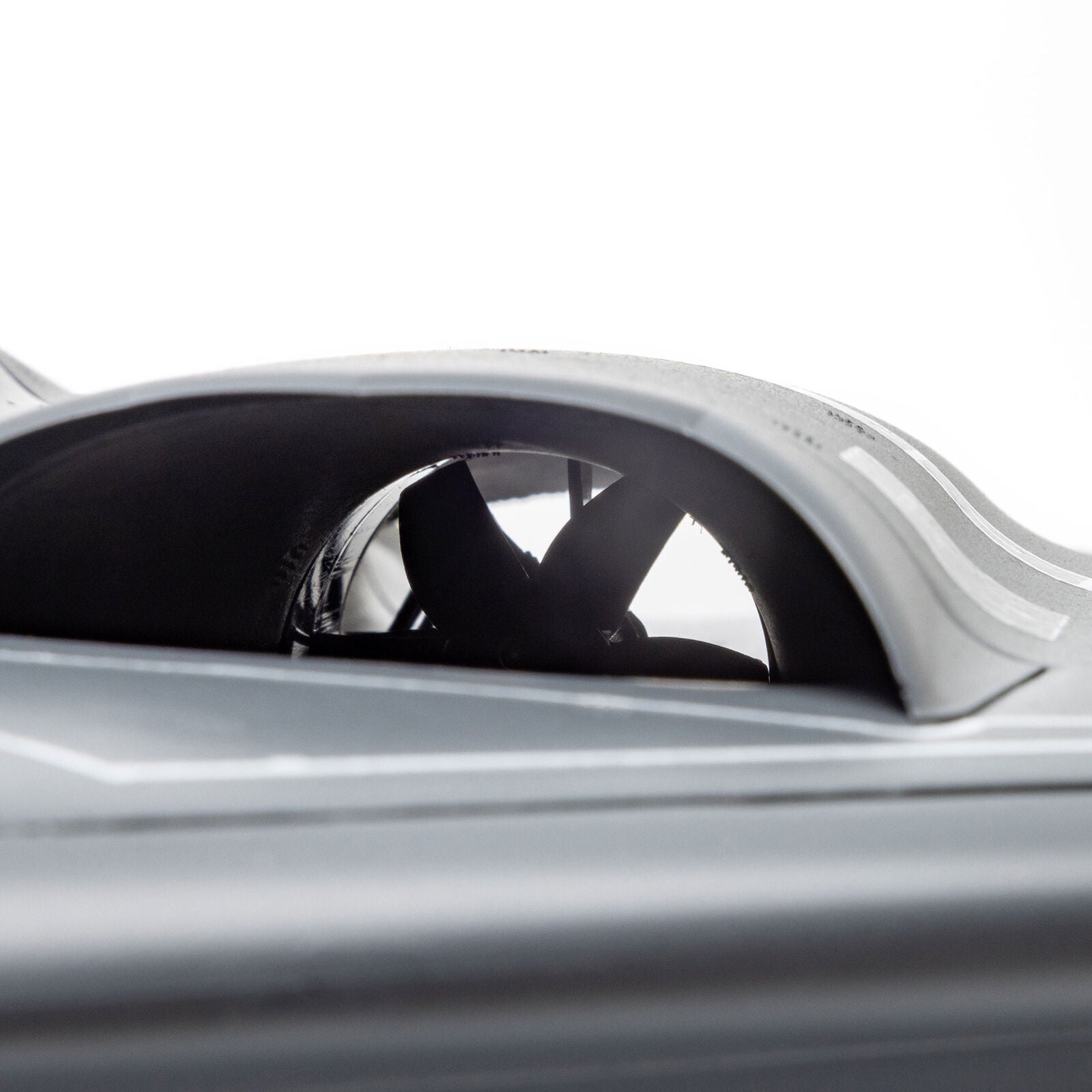 The expertly engineered design makes it stable enough to perform surprising aerobatics, including loops, rolls, and inverted flight, with or without the added stability of the optional-use transparent fin that snaps into place for easy installation and removal. The fixed landing gear and a steerable nose wheel, featuring multiple wheels like the full-scale aircraft, make it possible to taxi, take off from, and land on smooth surfaces. Or fly without the landing gear installed for more speed and performance while utilizing the molded-in finger grips and automatic Hand Launch Assist Mode for easy hand launching over and landings on grass. Either way, the E-flite Micro B-2 Spirit delivers an authentic, affordable, and convenient flying experience you simply can't get with any other model!