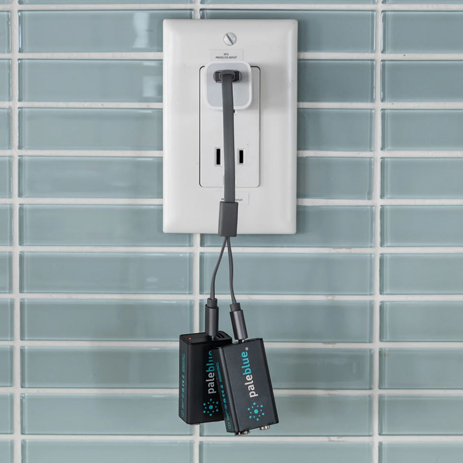 Includes 2 Paleblue 9V Batteries and 1 Charging Cable.