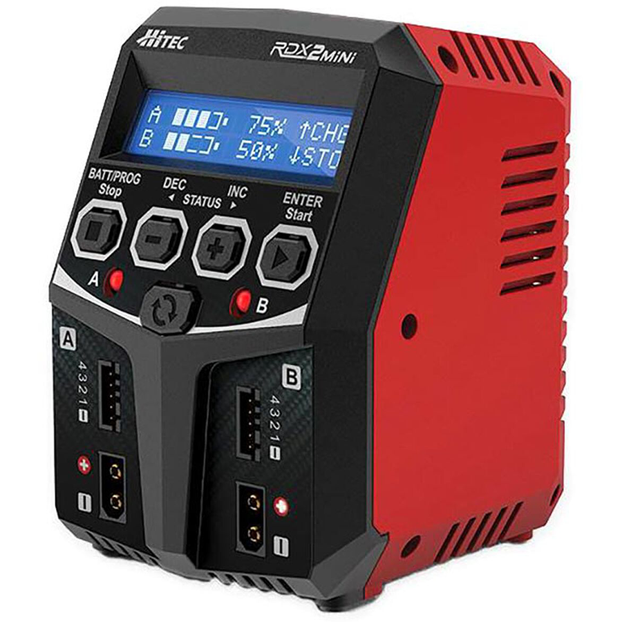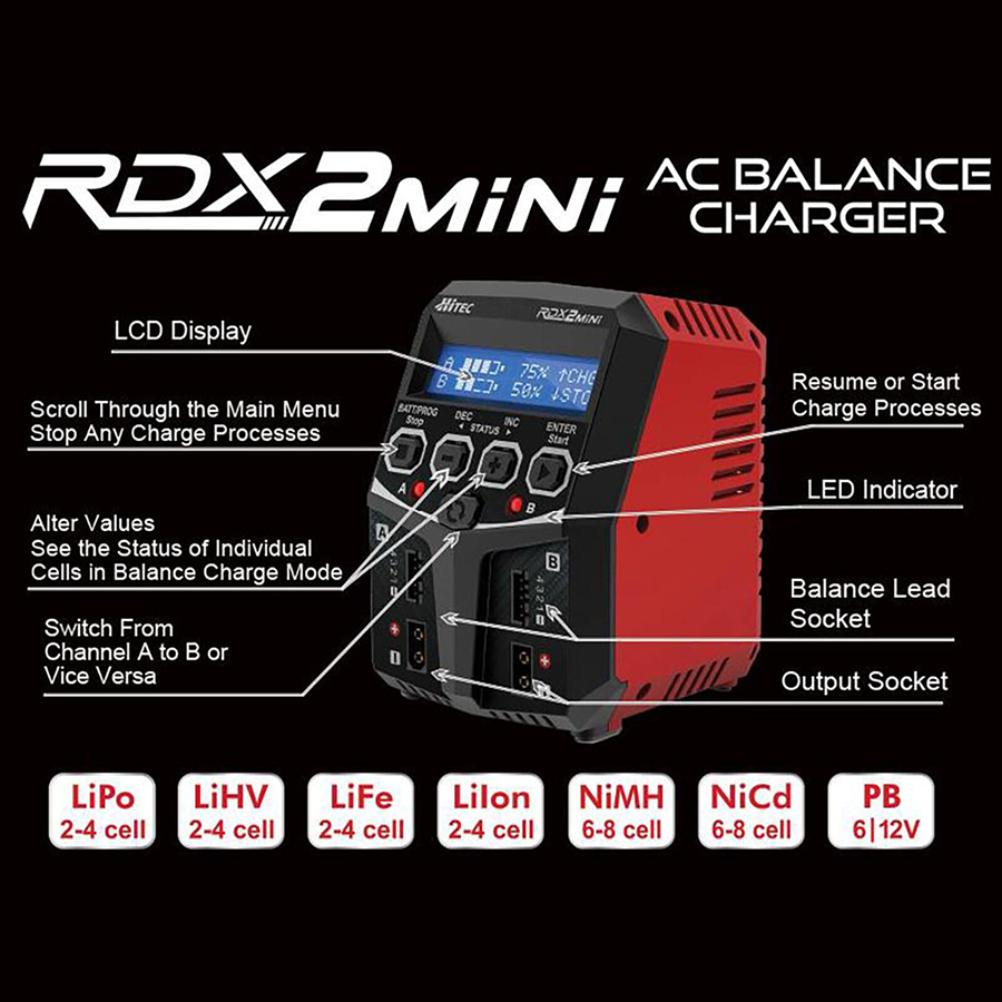 Hitec’s RDX2 Mini allows you to plug two batteries into one charger simultaneously; and it will intelligently and automatically initiate the charging of two batteries at once to their maximum capacity. Better yet, the batteries being charged do not need to have the same configuration. You can connect different battery chemistries (NiMH/NiCd/LiPo/LiFe/Lilon/LiHV/Pb) into any of the charging ports.