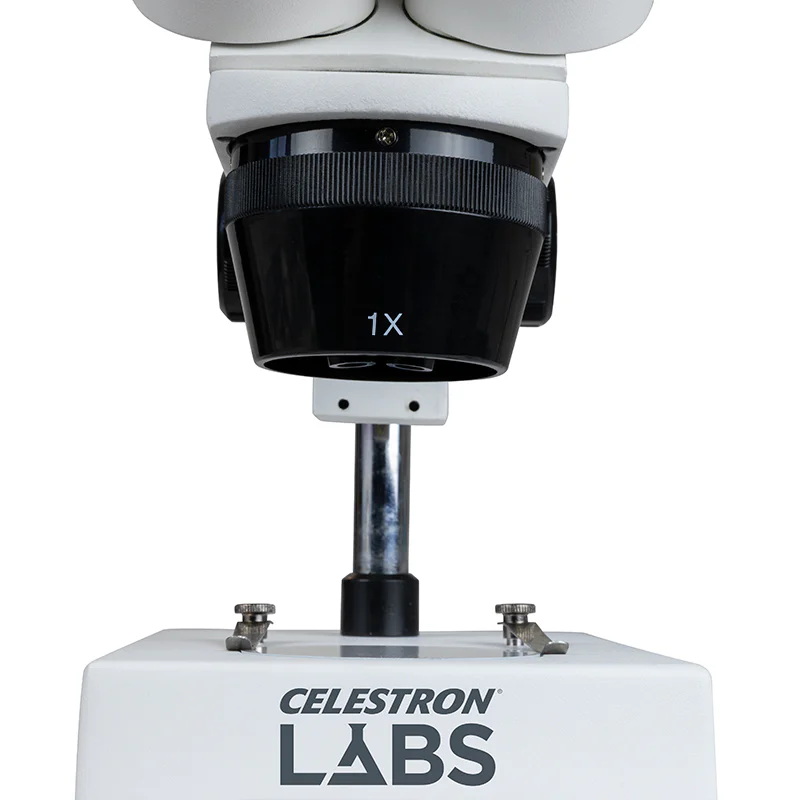 To accommodate large samples, you may need to expand your focus range by vertically sliding the head along the pillar stand to bring the image into sharp focus. For specimens that do not fit on the microscope base, like fossil bones, the Celestron Labs S10-30N microscope head can rotate around the pillar stand.