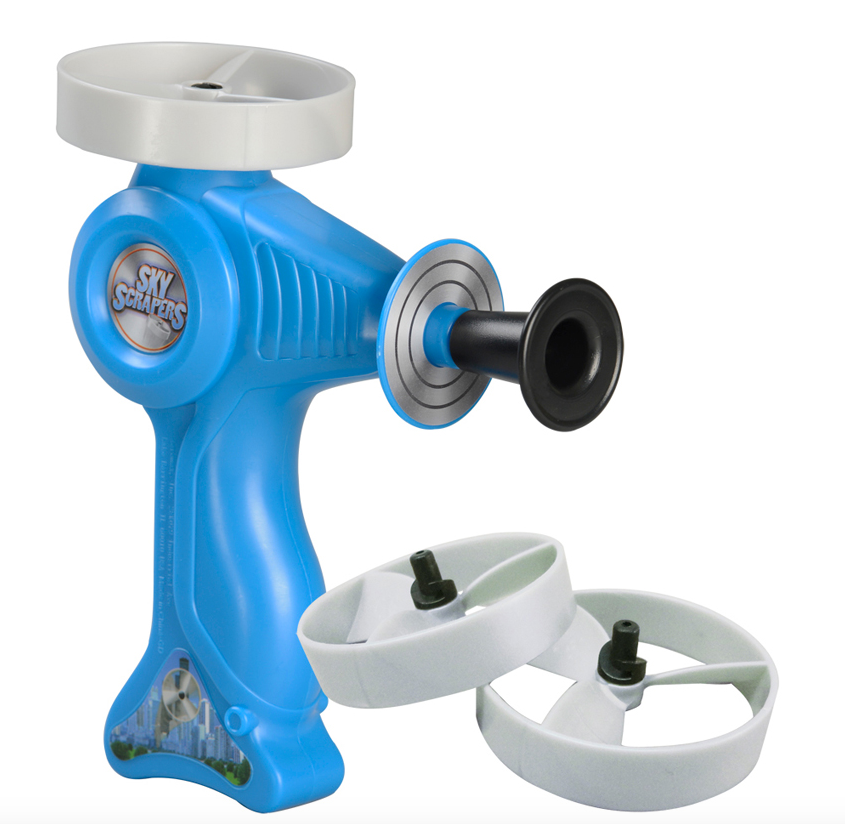 What’s able to leap a 10 story building with the pull of a string? Sky Scrapers! It soars over 100 feet without batteries. Simply pull the string and watch it fly through the sky. Includes launcher and 3 flying discs for hours upon hours of outdoor fun.
